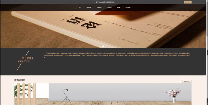 当人们打开系统的网址后,首先看到的就是首页界面。在这里,人们能够看到图书馆借阅系统的导航条,通过导航条导航进入各功能展示页面进行操作。系统首页界面如图5-1所示: