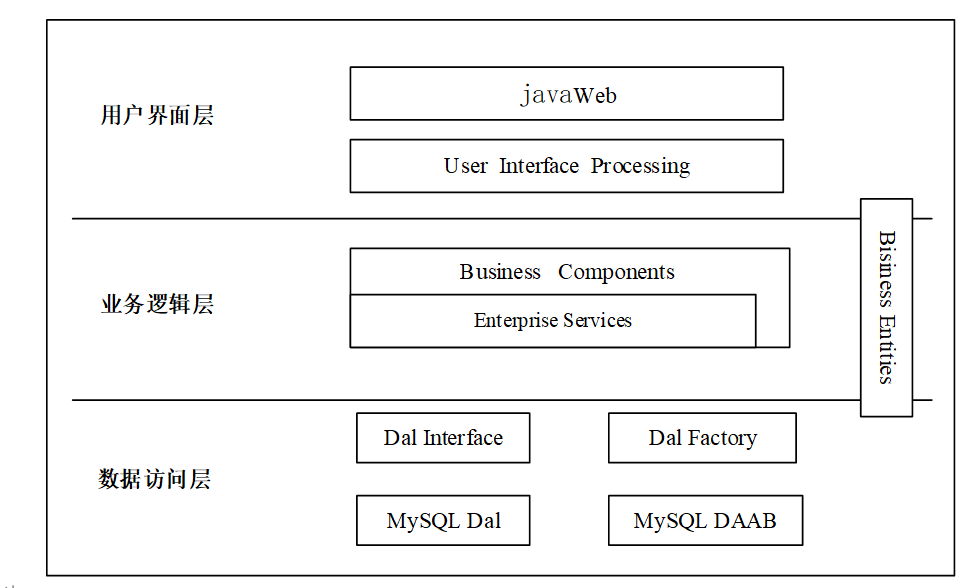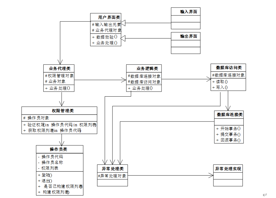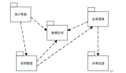 下面我们将根据架构设计原则和目标来建立系统的架构设计模型。将信息系统中对象分层,可分为三层:用户界面层、业务层、数据访问层(如下图4-2所示),再把各层中的一些公共部分提出来:权限管理、异常处理,这样得到包图如图4-3所示: