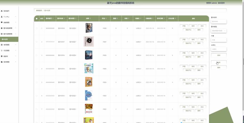 管理员点击图书信息管理。在图书信息页面输入图书名称、图书类型、作者、出版社进行查询、新增或删除图书信息列表,并根据需要对图书详情信息进行详情、借阅、修改、查看评论或删除操作;如图5-9所示: