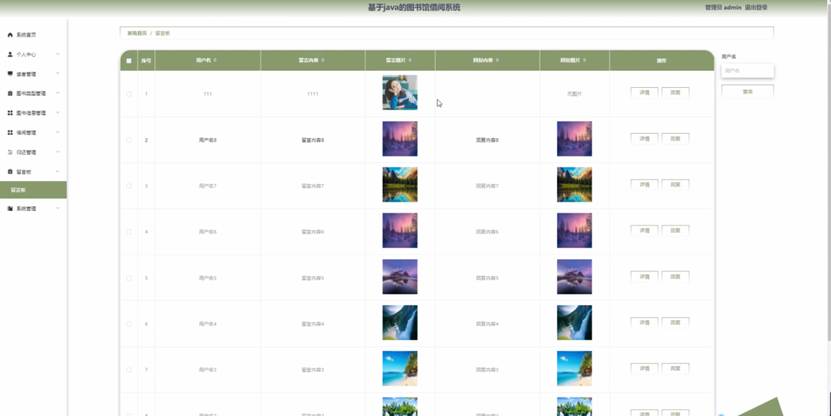 管理员点击留言板。在留言板页面输入用户名进行查询留言板列表,并根据需要对留言板详情信息进行详情、回复操作;如图5-12所示: