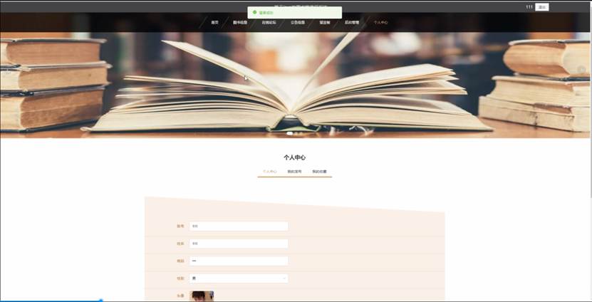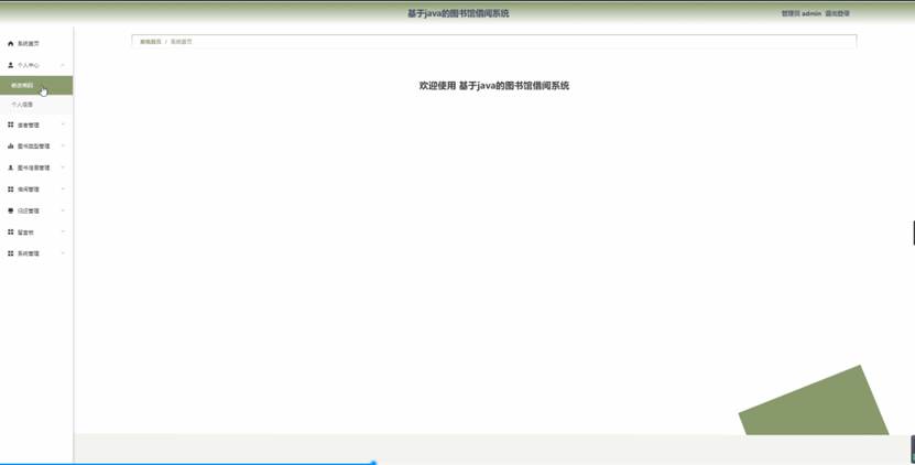 管理员进入主页面,主要功能包括对系统首页、个人中心、读者管理、图书类型管理、图书信息管理、借阅管理、归还管理、留言板、系统管理等进行操作。管理员主页面如图5-6所示: