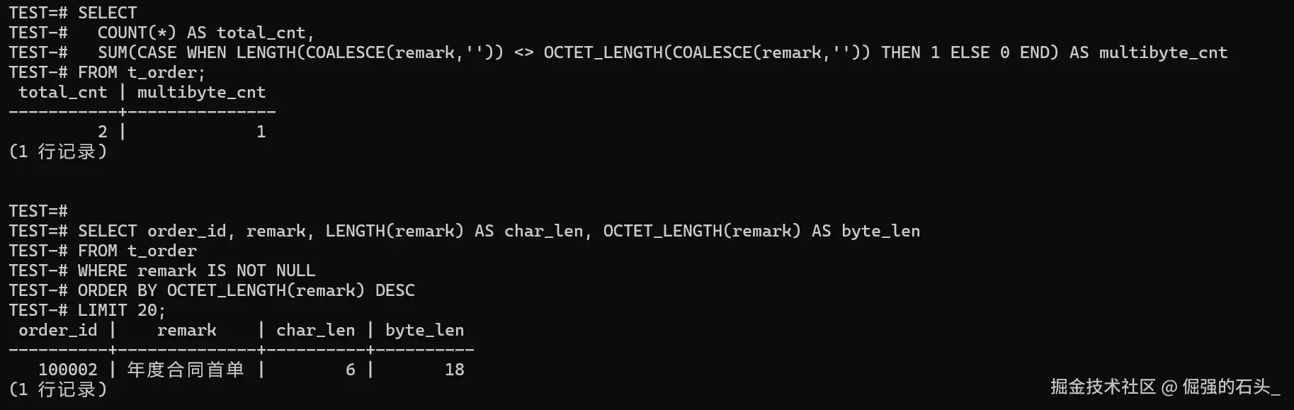 SELECT order_id, remark, LENGTH(remark) AS char_len, OCTET_LENGTH(remark) AS byte_len