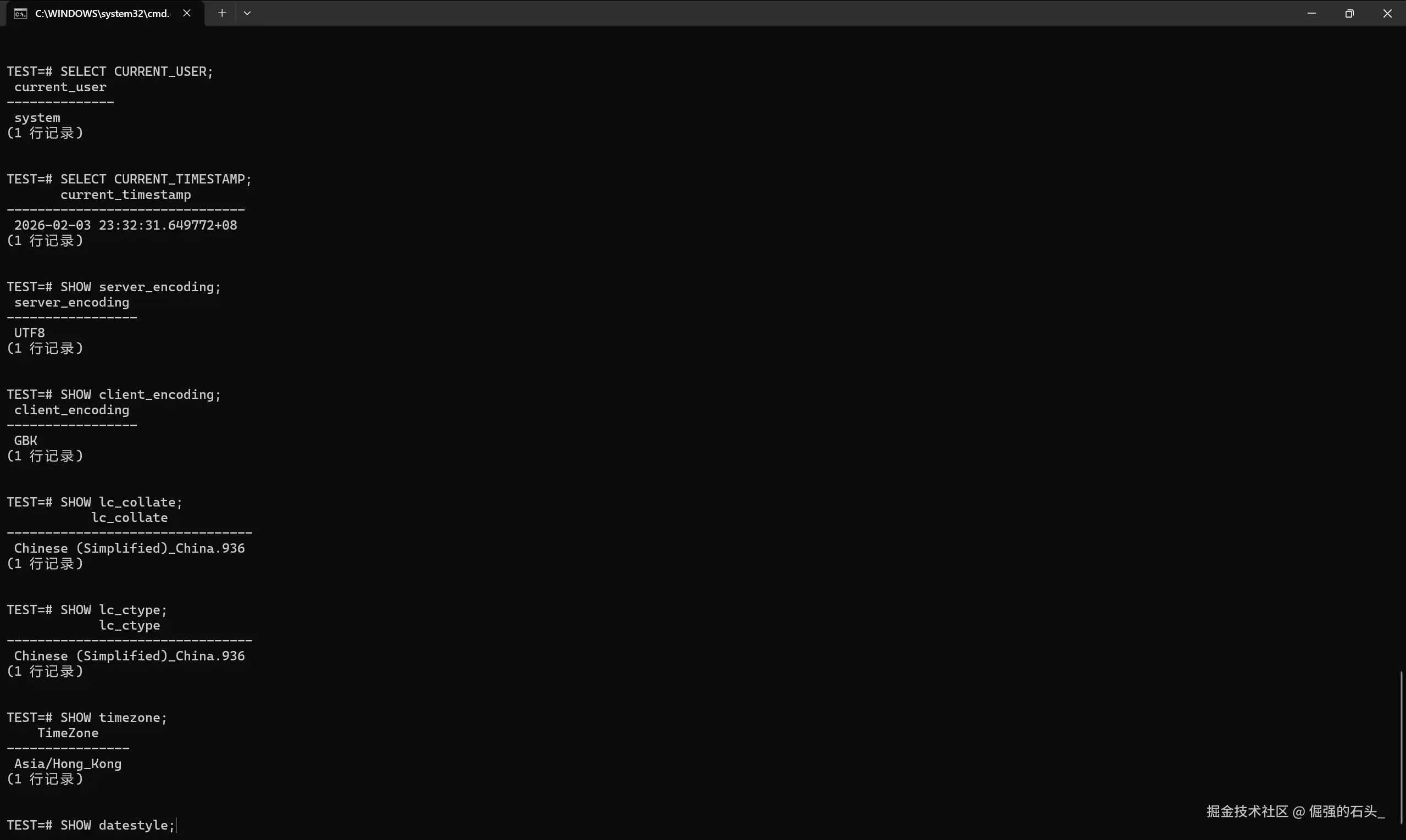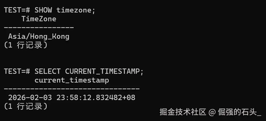 进到 test=# 以后,我会先把"会话口径"钉死(后续所有对账都按同一口径来,不然容易各说各话):