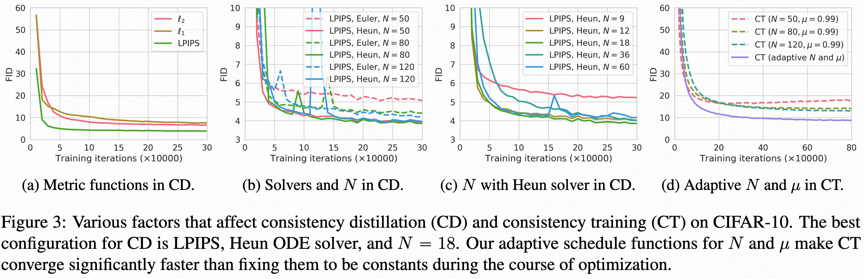 LPIPS是为衡量自然图像间相似性专设的,自然更适合CIFAR-10的图片;针对CD,Heun ODE求解器(阶数高点)和N=18(N达到一定程度后,CD的质量对N就不敏感了,其他数据集可能换一下)的设置是最好的选择,这和Karras et al. (2022 核心观点是预测去噪后的数据在数值上最自然)是对齐的。在CT中针对不同分辨率的和