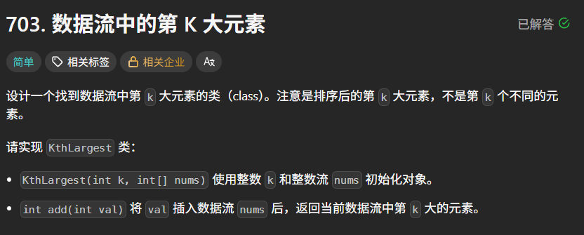 题目链接:力扣 703. 数据流中的第 K 大元素