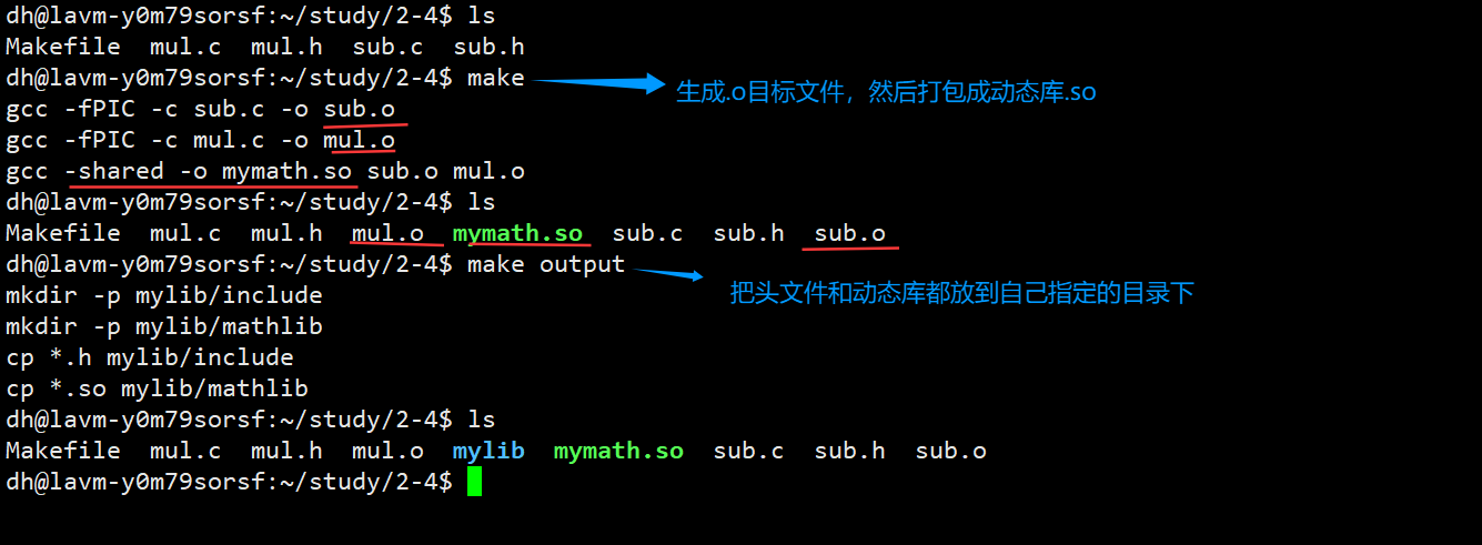 libmymath.so为例)的制作与使用:制作时需准备功能源文件(sub.c/mul.c)和头文件(sub.h/mul.h),通过gcc -fPIC生成位置无关码、-shared打包为动态库,并用Makefile自动化构建整理文件。 - 使用时需用