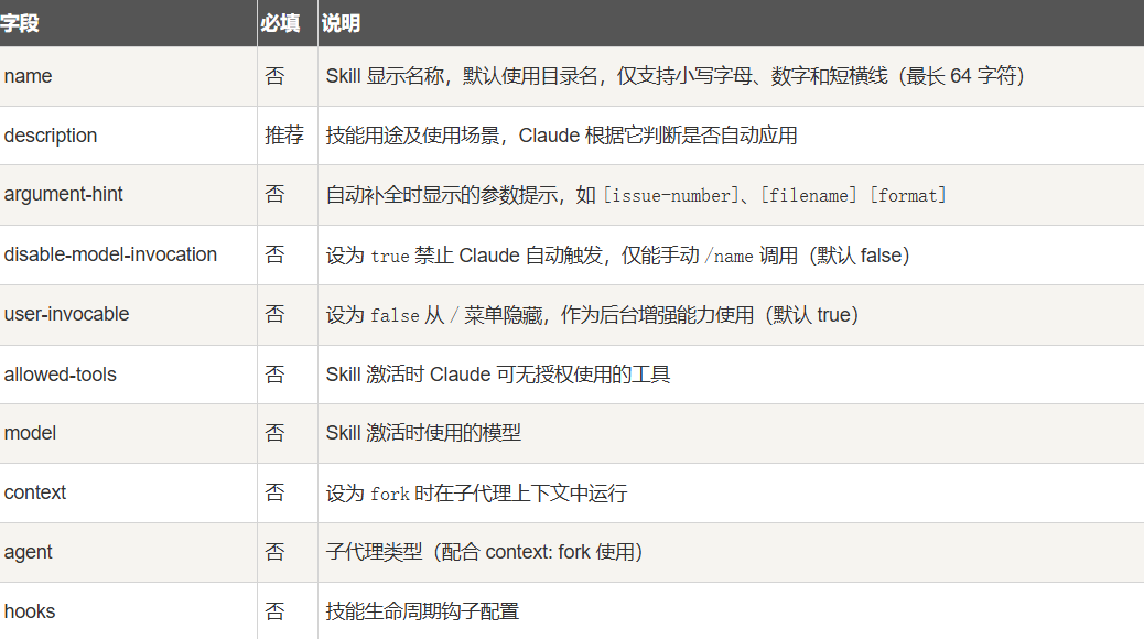 - 必填元数据:SKILL.md 开头的 YAML 块,需包含 name(名称)和 description(描述),启动时预加载至系统提示词