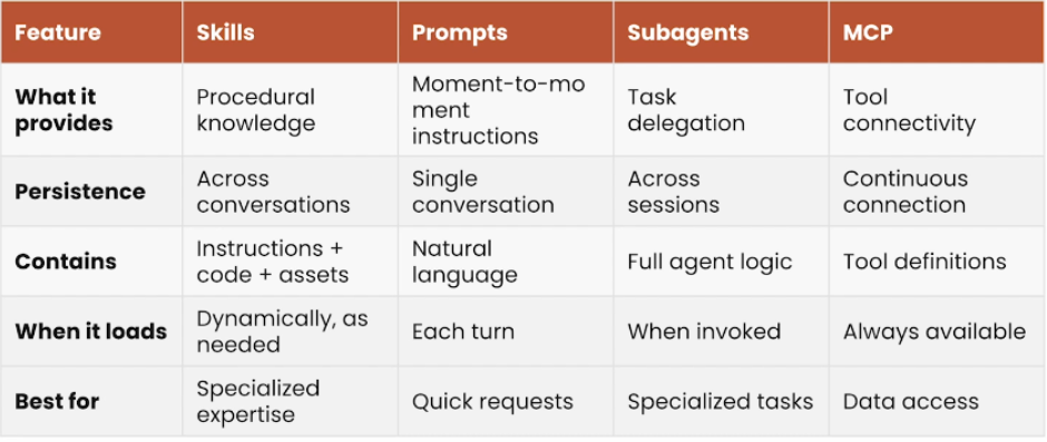 | Skills + MCP | 使用 MCP 从外部源获取数据,然后依靠技能来处理数据或高效检索数据 |