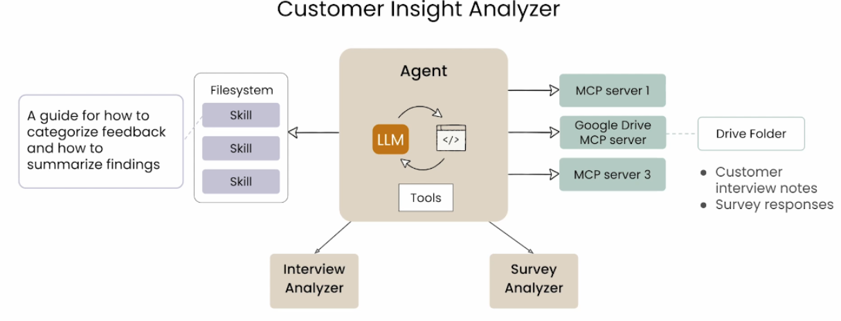 Filesystem 与 Skills 层构成了系统的能力基础设施;Filesystem 作为技能容器,封装了多个可复用的 Skill 模块,这些 Skill 是经过抽象的业务能力单元。左侧的指导文档("A guide for how to categorize feedback and how to summarize findings")作为元指令(Meta-prompt),定义了系统处理数据的标准方法论------包括分类维度、总结框架和质量标准。实现了"知识即配置"的理念:通过修改指导文档即可调整系统行为,无需改动底层代码,Skills 层向下为分析器提供标准化工具支持,向上为 Agent 提供可编排的能力单元,确保分析过程的一致性和可维护性。