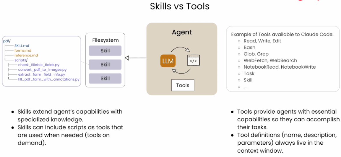 | 提供访问文件系统的方式 | 扩展智能体的能力,提供专业知识和指令 |