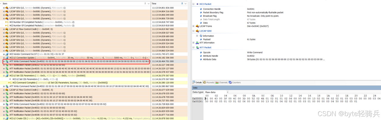 CIS流必须绑定到已有的ACL连接(即之前建立的逻辑连接0x0041)------因为CIS依赖ACL连接完成**"控制信令交互"**(如流参数协商),而音频数据则通过独立的ISO通道传输。