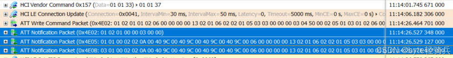 从报文可看到,Track Position的更新间隔约为3.75s(从40ms到3.75s)------这是因为ATT Notification的更新频率低于音频帧频率,但音频帧本身是每10ms传输一次,保障了"声音的连续性"。