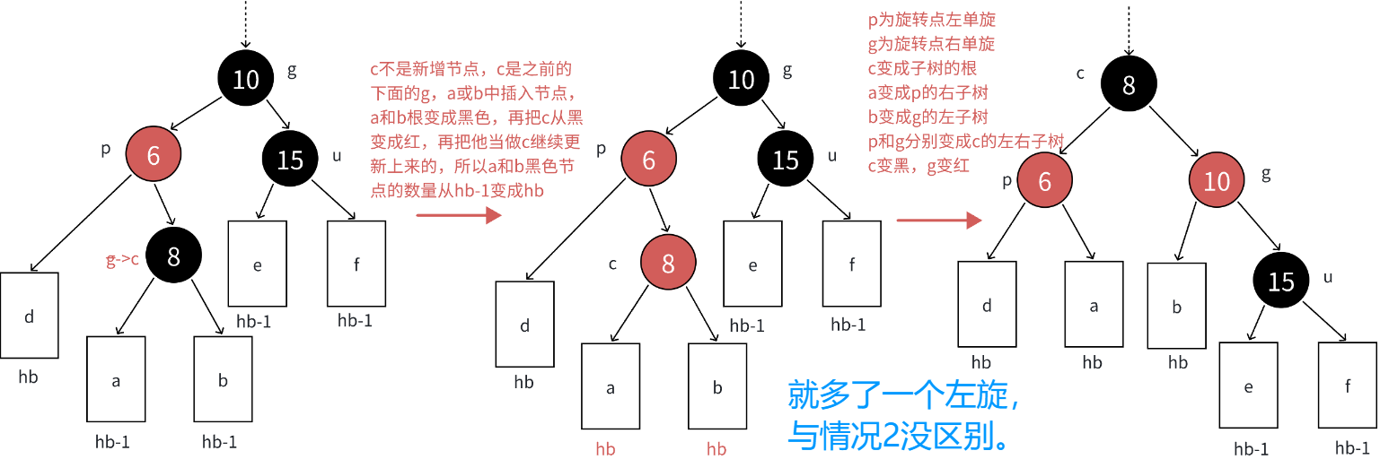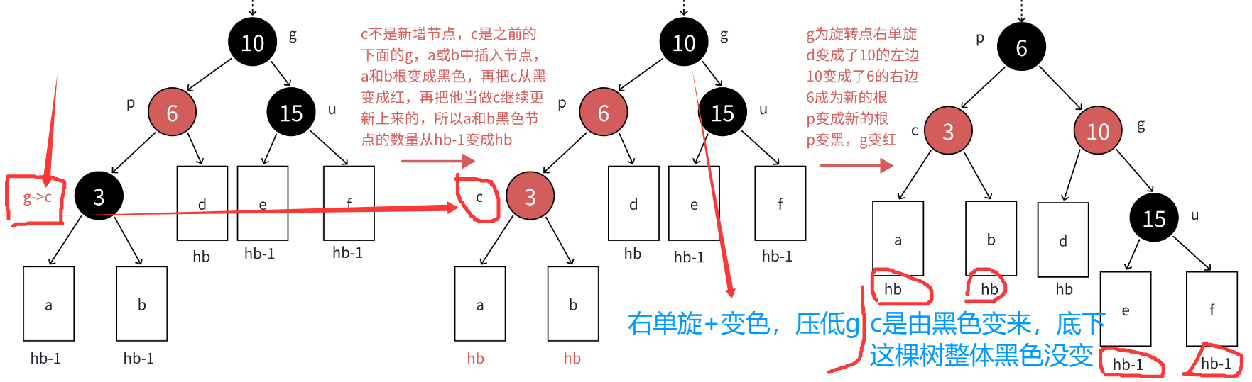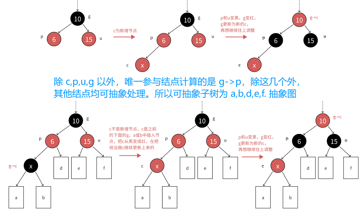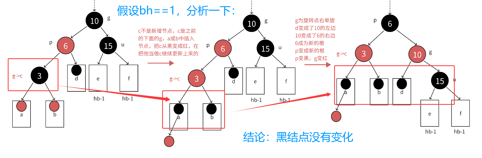 当u存在且为红,c是黑色变来的。之前分析过,该子树黑高是不变的,c的黑色转移到抽象的子树中了(pu变黑,g变红,通过g的黑高没变化),所以别看具体是右边黑结点多一个,其实左边的转移到抽象子树中了。