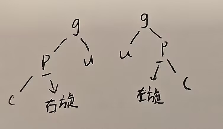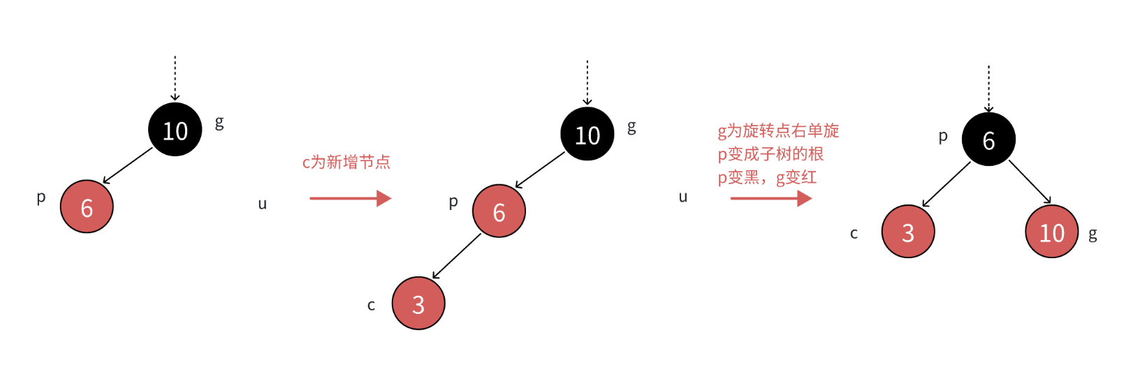 分析:p必须变黑,才能解决连续红色结点。u不存在,或存在且为黑,也就是无法变黑,那必然导致黑高失衡。此时单纯变色(怎么变色,都是少一个黑高)无法解决问题,需要旋转+变色: