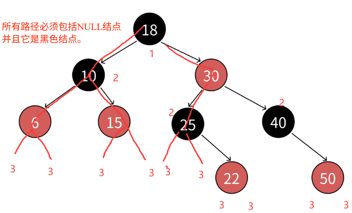 7.红黑树中所有路径的统计必须以黑色的 NULL 叶子结点为终点,它必须是黑色的。