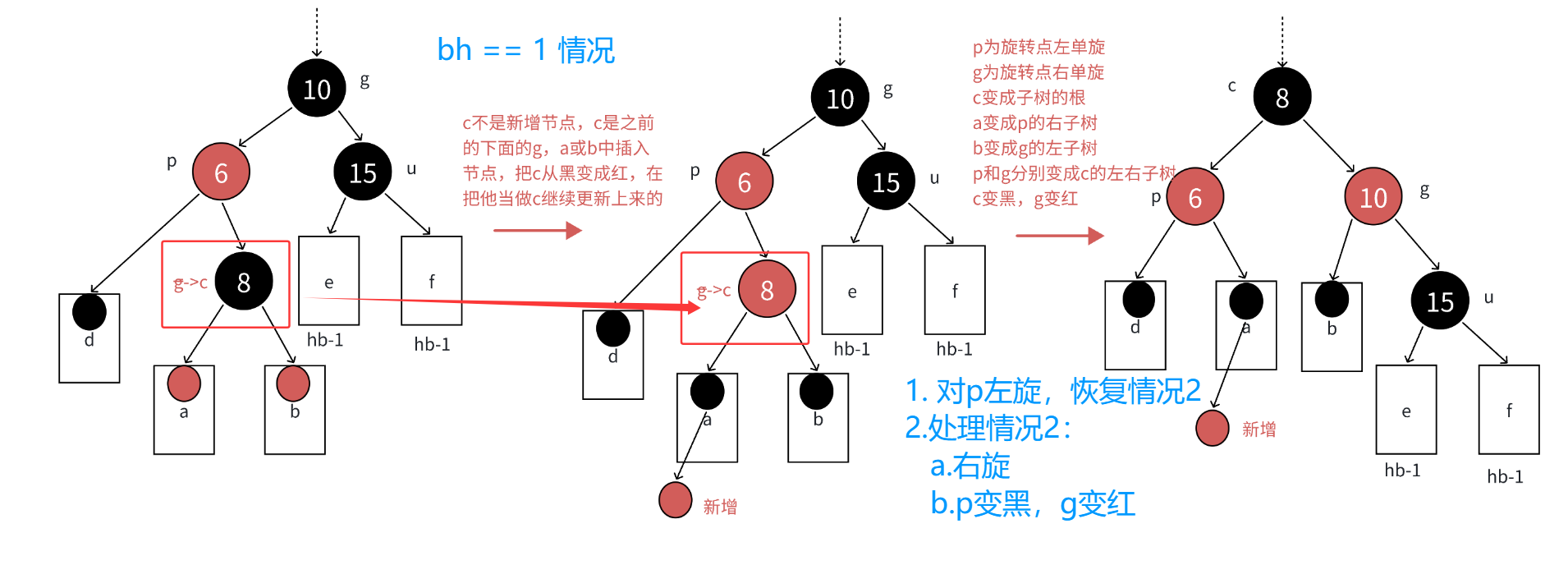 u存在且为黑,c一定不是新增结点(如果已存在,c必然是黑色结点,但却是红色,所以:c一定是之前符合情况1,向上更新的途中,由g变为c的,变色过后的。)