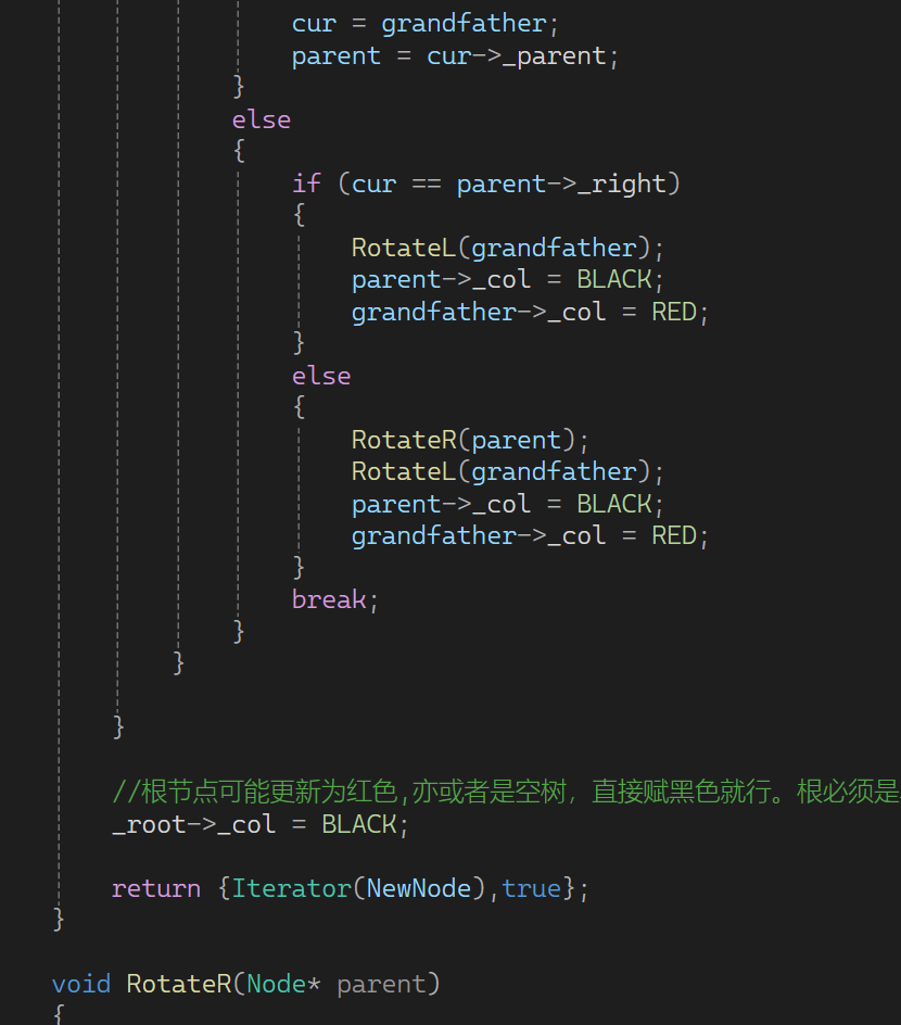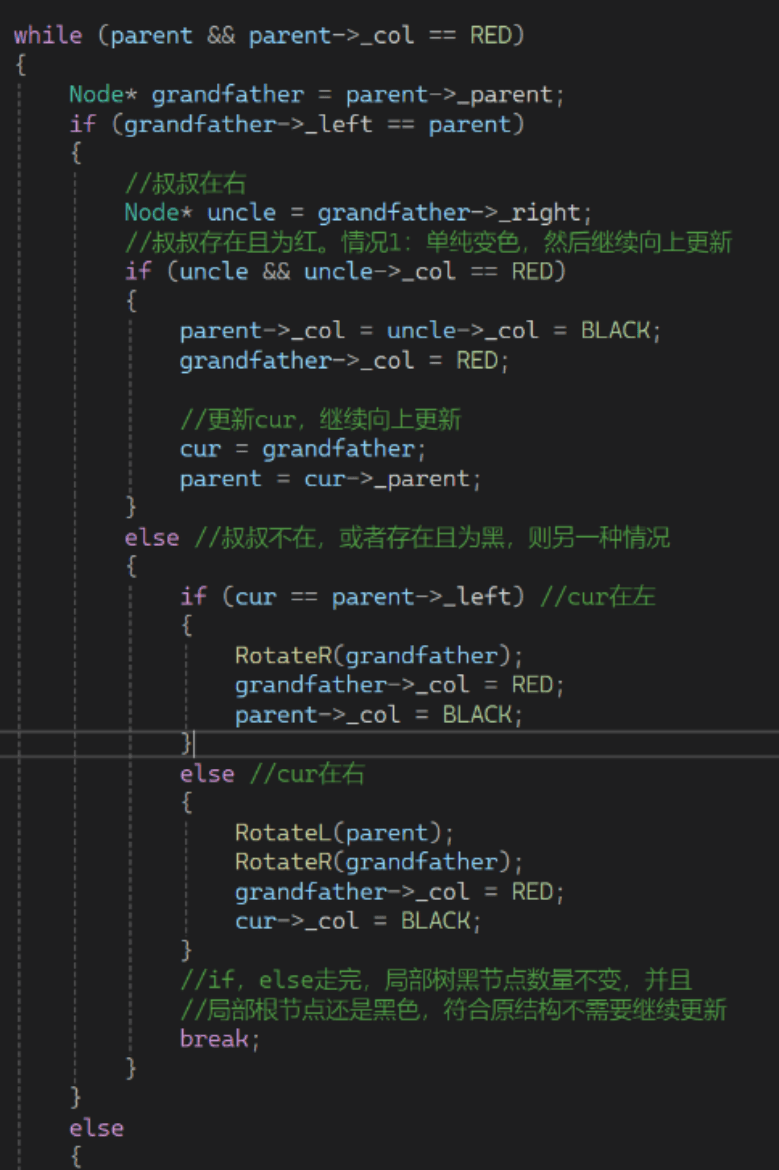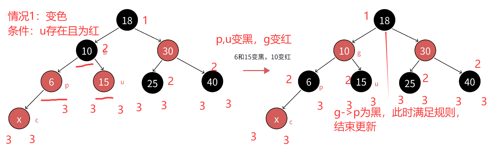 情况1:变色:条件:u存在且为红 ,只需要将p,u变黑色,g变红色(g往下的路径,黑色结点数量还是不变,子树整体不受到影响,外层视作无变化,内部结构变了)。若g的p为黑色,无连续红色,结束更新。反之继续往上更新(c变成g,对应关系都变化)。若更新到了根,则不需要向上更新(g->p为空),把(g)根节点改为黑色。