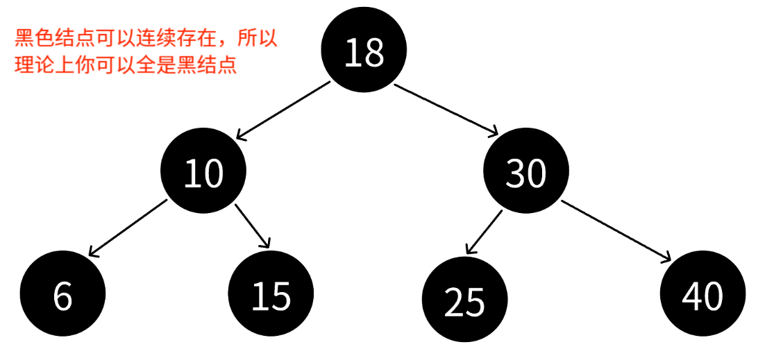 3.如果一个结点是红色的,那与它直接相连的必须为黑色。也就是说:一条路径中不会出现连续的红色结点。