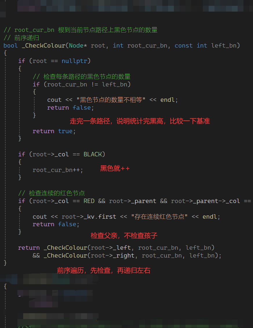 2.还可以检查是否有连续红色:root为红,root父存在且为红,直接返回false(查找孩子是否是红色结点很难,因为可能不存在,但是查找父亲就容易,所以查找父亲来判断)