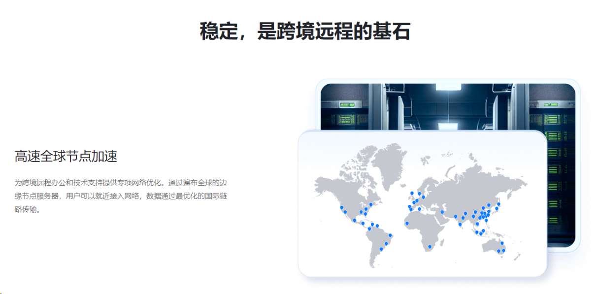 - 灵活的经济型方案:其"全球节点"服务提供按被控设备绑定与不限被控设备两种模式。企业可根据实际海外设备数量,选择最具成本效益的方案,避免了为不必要的无限授权支付溢价。