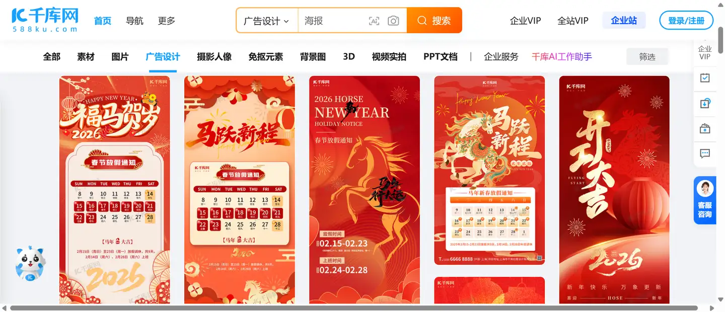 千库网是一个综合性的设计素材网站,不仅有海量的海报模板,还有图片、字体、图标、视频等各种设计素材,它的核心优势就是版权清晰、素材优质,尤其是适合需要商用春节海报的用户,比如企业、商家、自媒体等,用这里的模板和素材,不用担心侵权问题,使用起来更安心。