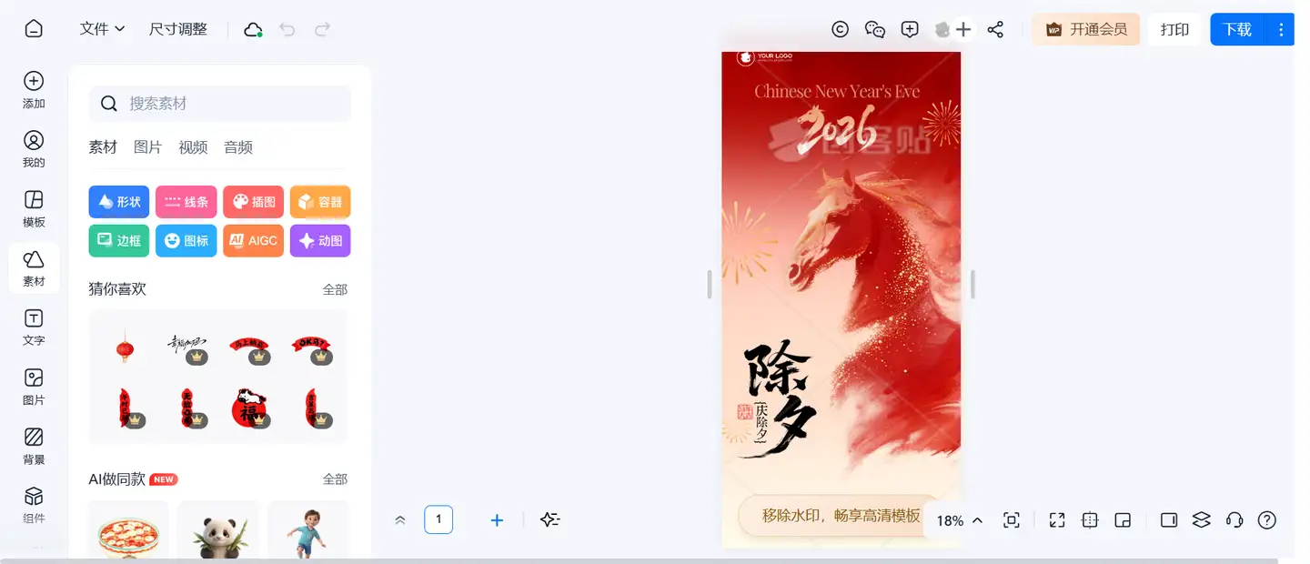 站内的画布编辑界面同样十分好操作,它不要求掌握高难度的设计专业技能,因为站内大部分编辑操作都可以通过拖拽完成,并且创客贴站内还提供了1亿+正版图片素材,还有1400+商用字体,这些素材支持在画布界面直接调用,让你省去查找素材的时间成本,在创客贴站内一站式完成春节海报设计。创客贴站内提供的素材都经过严格审查,商用无风险。