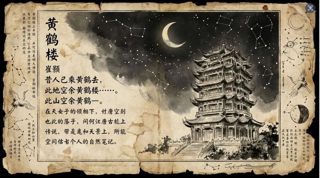 请为《黄鹤楼》生成一个古老的手稿页,有星星和旁注的墨水图,书页风格