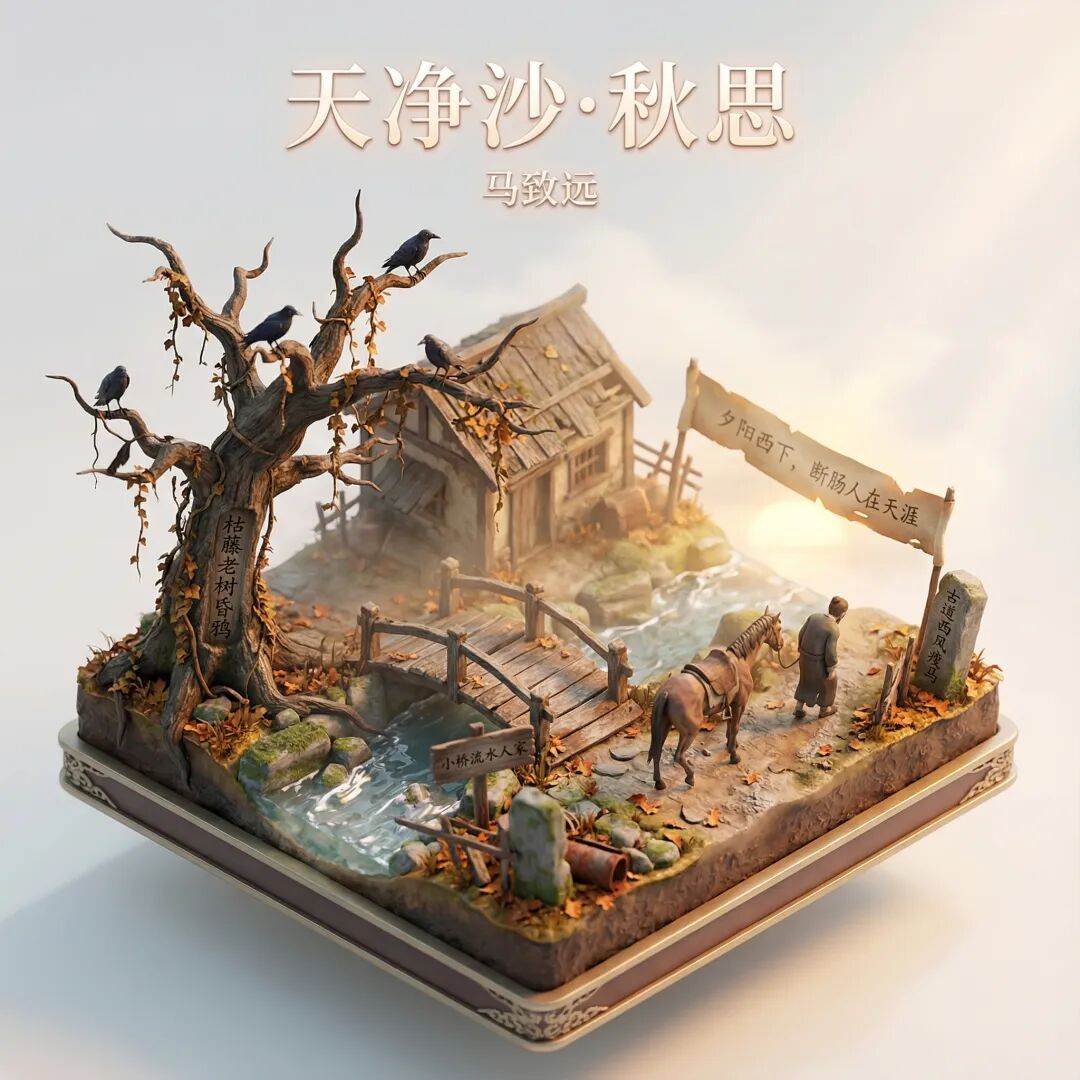 呈现一个博物馆级45°俯视等距微缩模型世界,采用顶级PBR材质、极致手工雕塑细节与温暖电影级照明精心打造。整个场景必须像珍藏级的实体模型,触感真实,氛围柔和深邃,令人一秒沉浸。先深入分析以下这首诗,提炼出最核心的意象、标志性场景、情绪基调、象征元素、季节与光线时段、内在渴望或叙事张力,将它们凝练成一个情感浓度极高的微型3D诗意世界。以《天净沙·秋思》、《江南》、《饮湖上初晴雨后》三首诗词为例