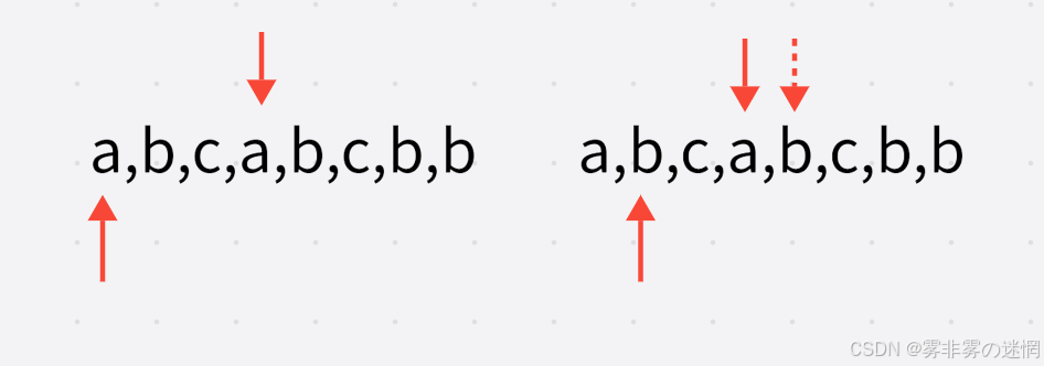 算法解析:我们看图,找到重复之后,left++,right就没必要回来了,反正right一定移动到上一次结尾的下一个位置,所以遇到重复的就left++,否则right一直向前。范围里的元素出现次数都为1