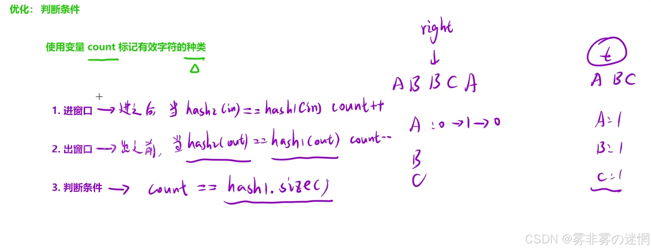 if(hash2[out]-- == hash1[out]) count--; // 出窗⼝ + 维护 count