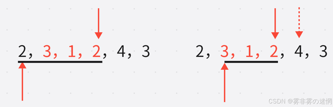 此时第一段有效区间是【2,3,1,2】,即left指向位置为2(0),right指向位置位2(3)