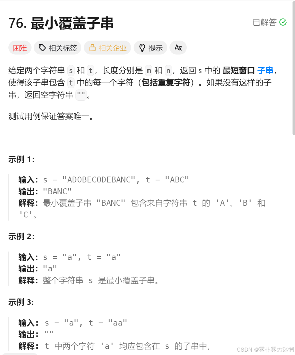 这题的主要困难就是 t 中的元素可能重复,否则直接被 **unordered_map<char,int>**秒杀,因此要解决重复的情况,可以引入一个变量 count ,先用 hash2 【】遍历 t 中的元素,获得有效元素个数,当 right 每次找到一个元素就让 hash1 【】该元素,如果该元素【】的value和hash2的相等,就count++,当count和"获得有效元素个数"相等,即单次范围划分完毕!count是种类不是个数