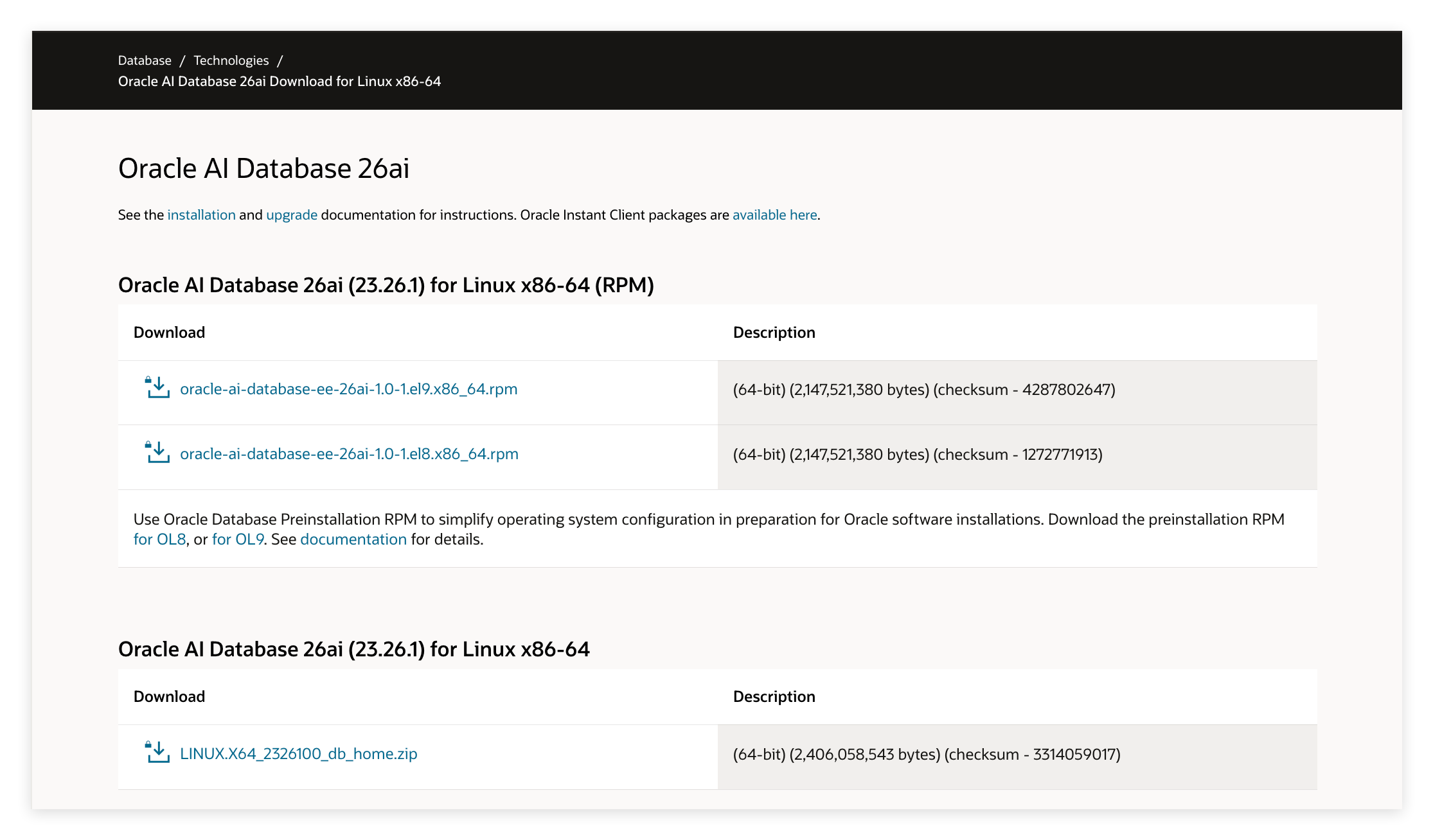 要安装Oracle 26ai,请先从其官方网站下载两个必需的RPM包:预安装包(Preinstall)和企业版数据库安装包(Enterprise Edition)