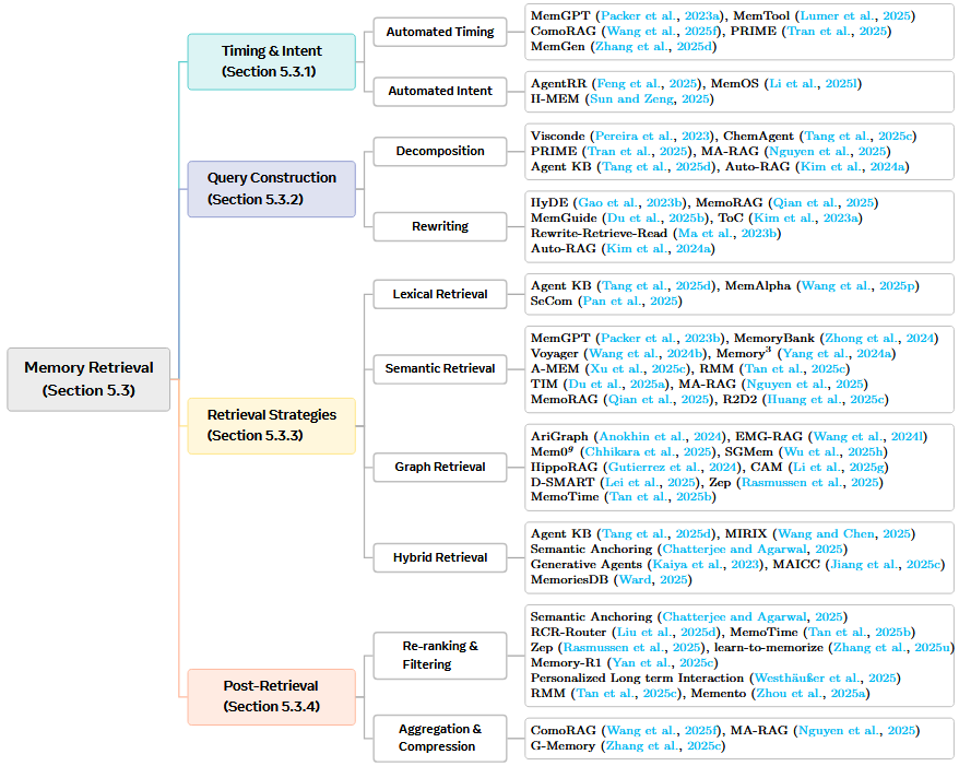 - 检索范式:识别、过滤、选择现有记忆条目(向量相似度搜索、混合检索、图遍历)