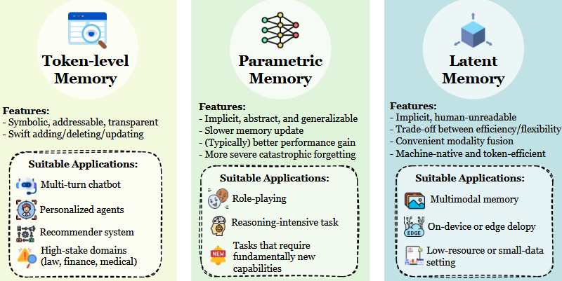 - 形式层面:令牌级、参数化、潜变量三种主要实现,在表示、适应性和与智能体策略集成方面呈现根本不同的权衡