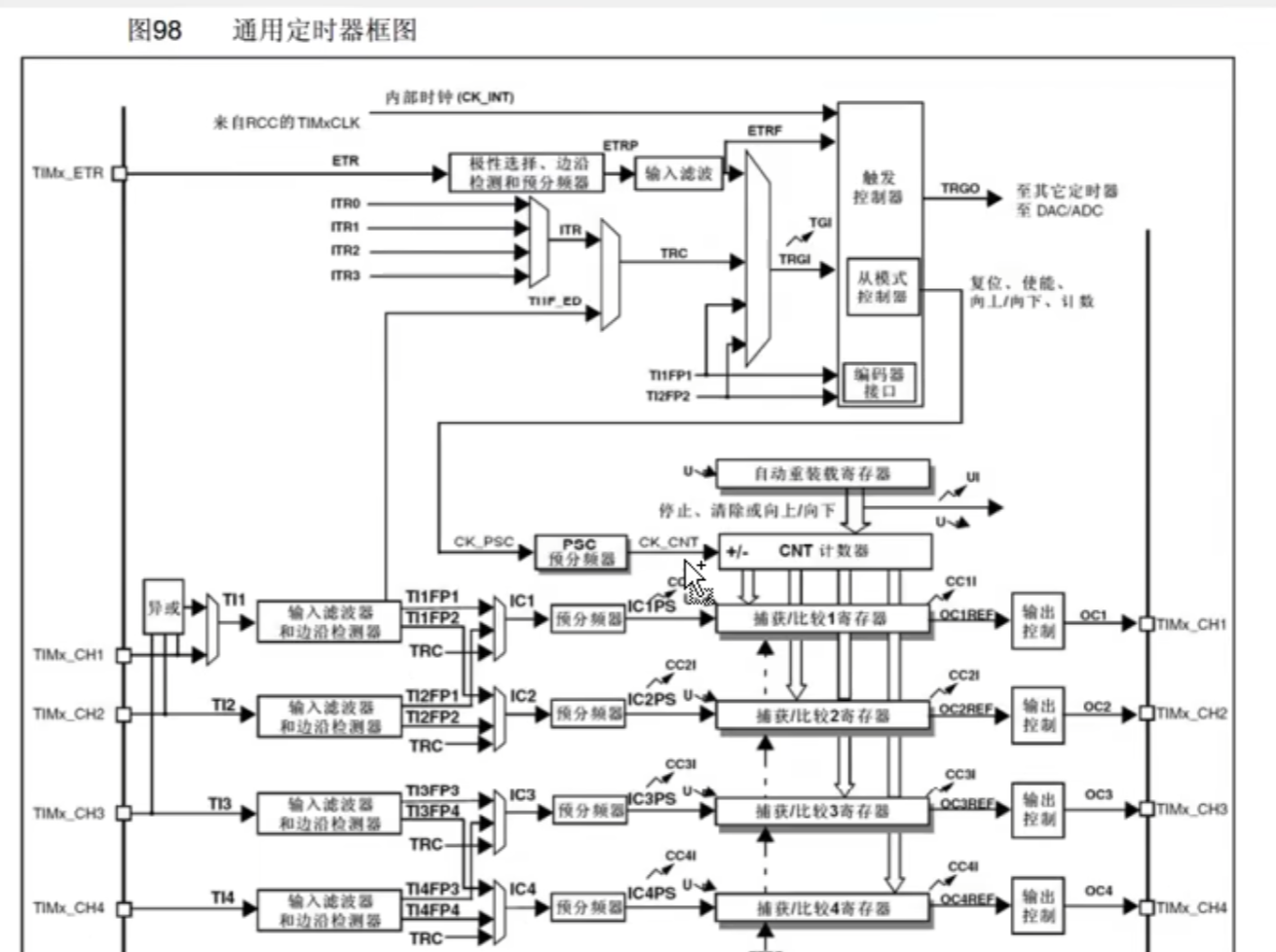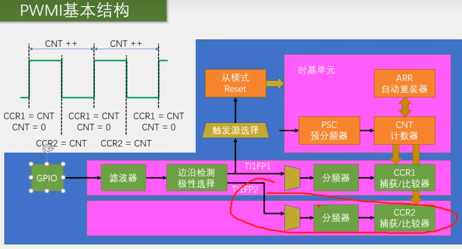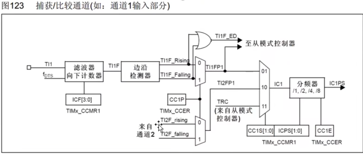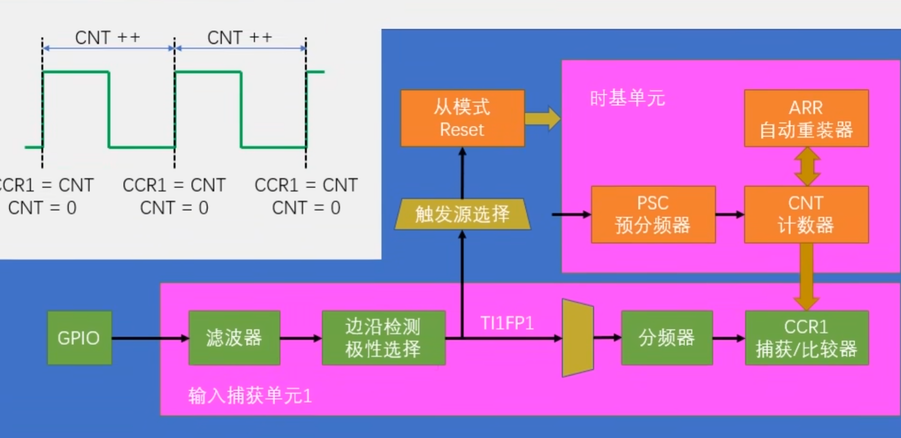 作用:输入的电平发生指定变化时,CNT计数器的值进入CCR捕获比较寄存器。