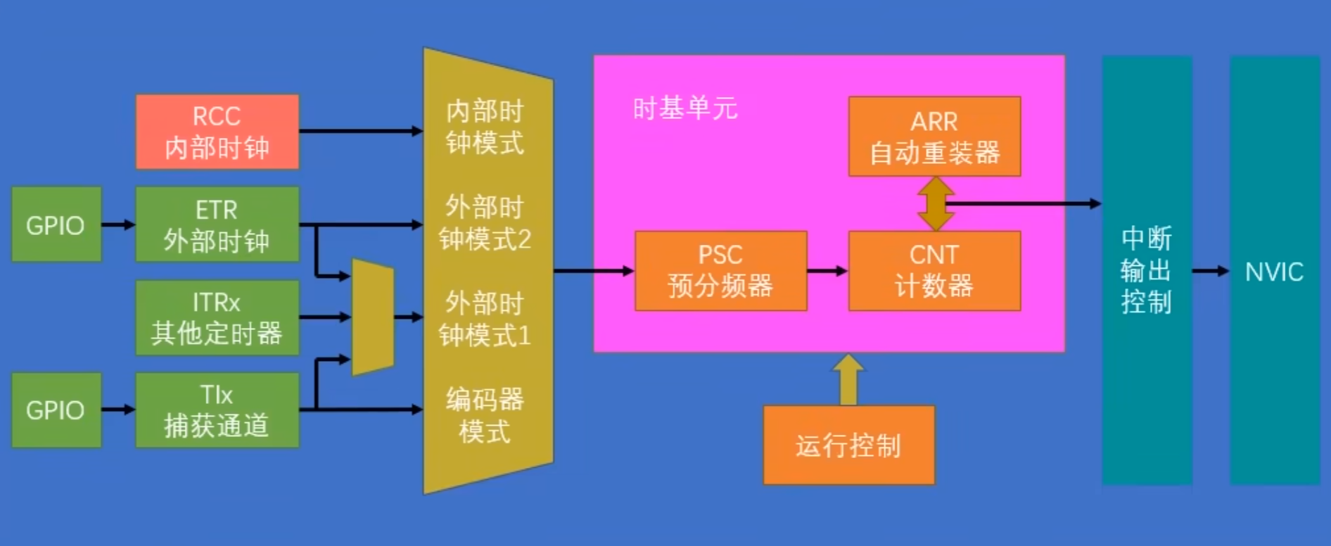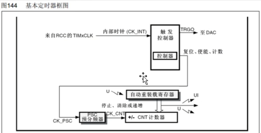 预分频器,计数器,自动重装载寄存器。(注意:预分频器的值为:输入/值+1==输出,最大设置值为65535)当计数器==自动重装寄存器时,发送中断信号(更新中断),这个信号到达NVIC