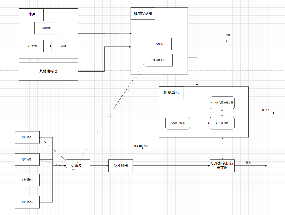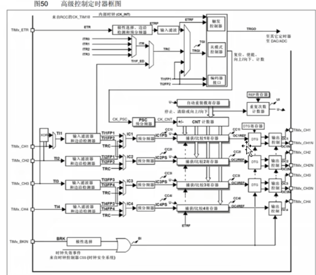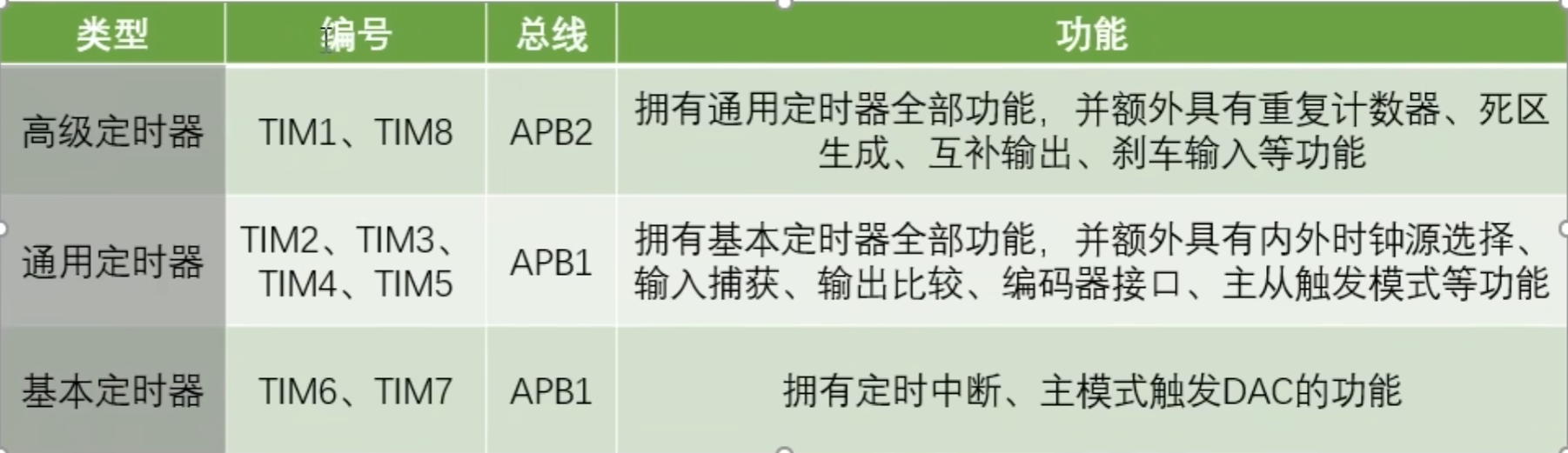 其他功能:选择内外时钟源,输入捕获,输出比较,编码器接口,主从触发模式。