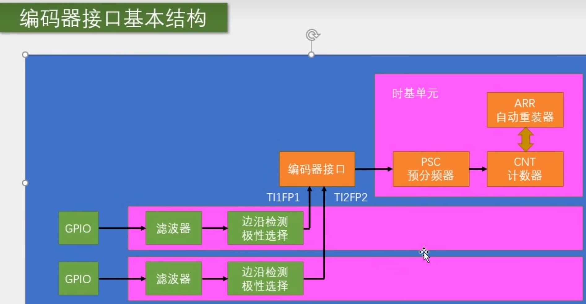 高级定时器和通用定时器都有1个编码器接口,借用输入捕获通道1,2