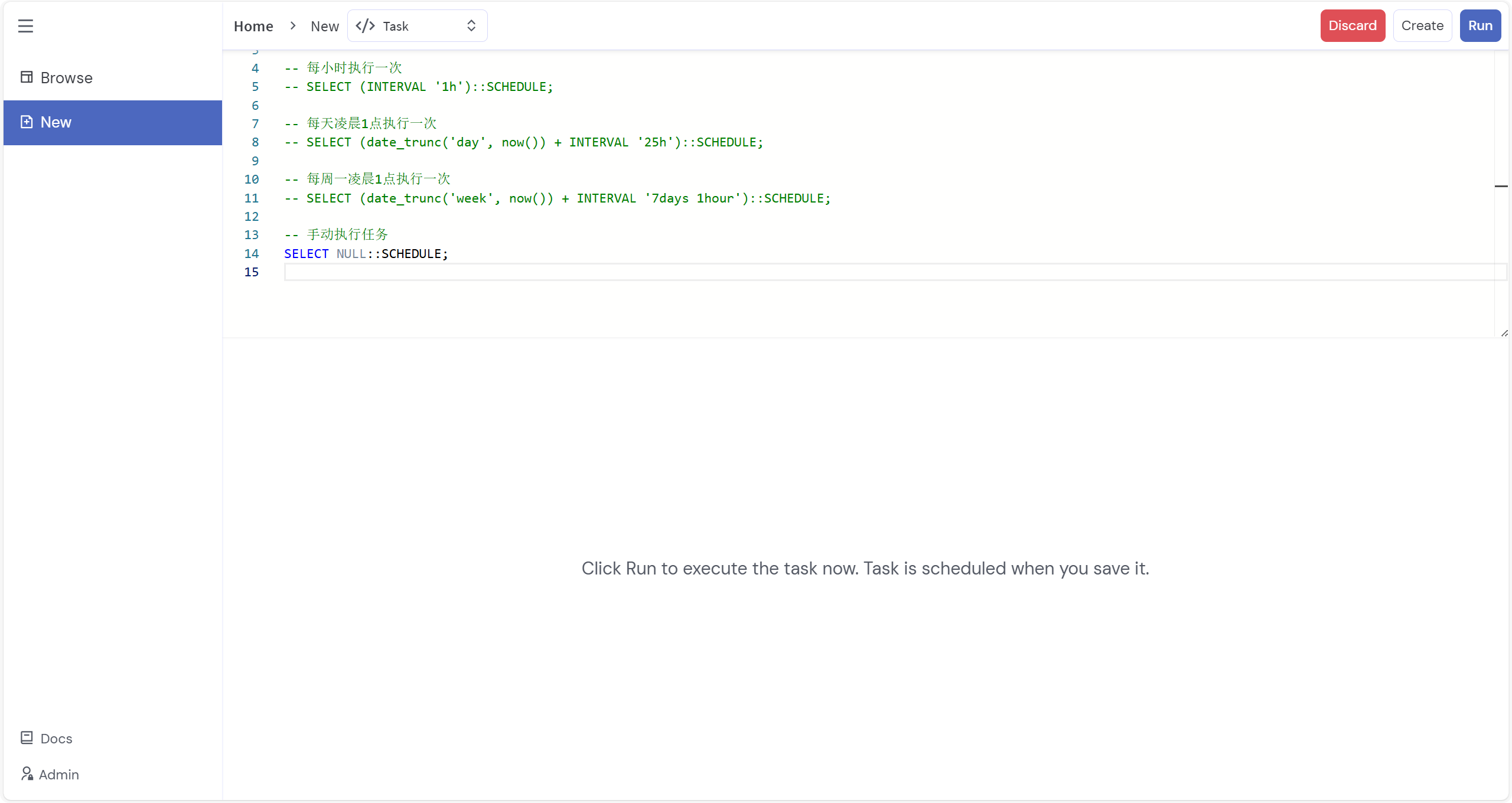 - 定时任务:支持创建定时任务,自动执行 SQL 脚本,可以用于加载远程数据、执行数据转换、清理历史数据等。