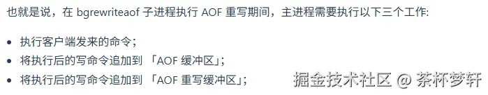 BGREWRITEAOF(重写)时,Redis fork 出子进程重写 AOF; - 在重写期间,主线程继续处理写命令,并把这些命令 写入旧 AOF 文件(正常追加);
