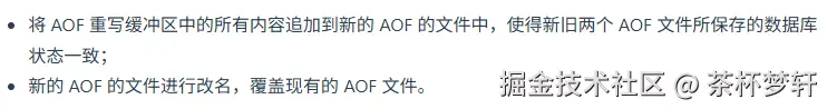 - 最后,父进程做原子重命名 / 文件替换,切换到新的 AOF 日志,从此向新日志继续写命令。