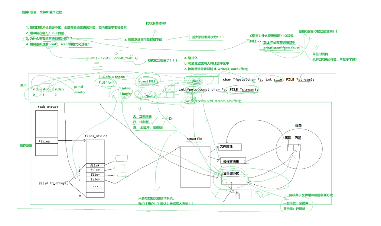 用户想把数据写到显示器上,例如调用fputs,他会先把数据写到FILE管理的缓冲区数组中,在通过系统调用write(),刷新到内核文件缓冲区。