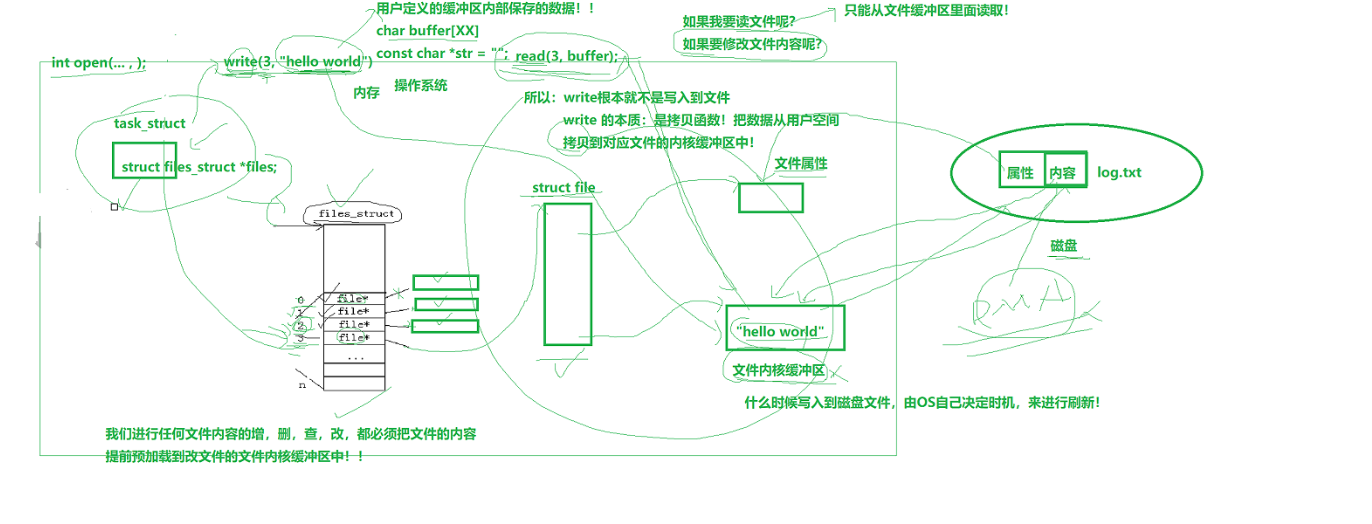 struct file中是有文件缓冲区的用来存储文件的内容,我们的read与write不是直接与磁盘文件接触而是与文件缓冲区接触