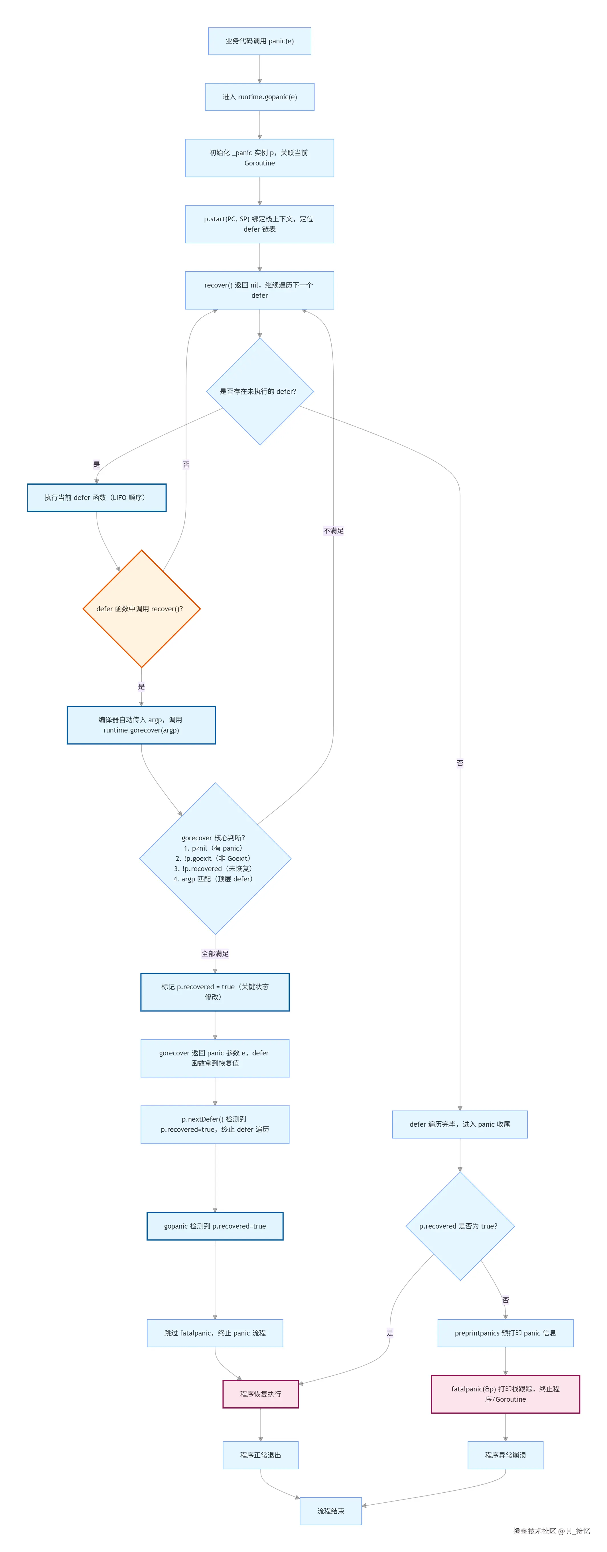 发现panic恢复.则runtime.gopanic()将结束当前panic流程.程序恢复正常流程.