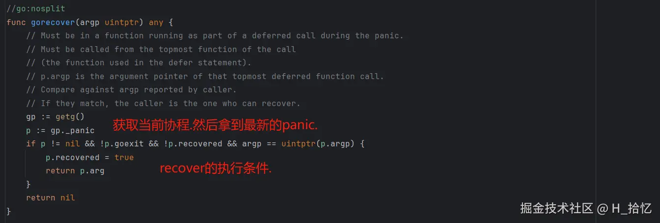 通过源码的if语句可以看到需要满足四个条件才可以恢复panic.且四个条件缺一不可.