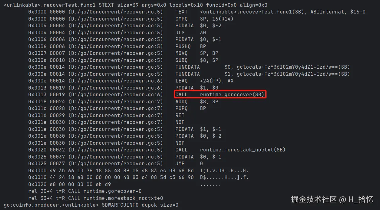 可以看到recover()函数调用被替换成了runtime.gorecover()函数.