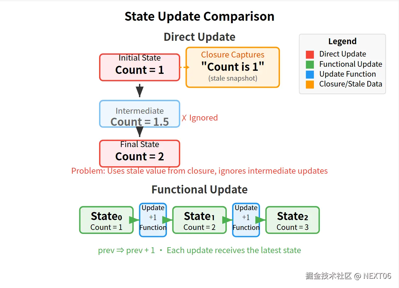 - 函数式更新 setCount(prev => prev + 1) 就像是在当前的画布上直接添上一笔,无论之前的状态如何流转,它总是基于最新的真实数据。