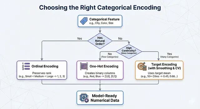 实际操作中可以这样判断:特征有天然顺序就用 Ordinal Encoding;没有顺序、类别数量也不多就用 One-Hot Encoding;类别太多就上 Target Encoding,记得配合 Smoothing 和交叉验证。
