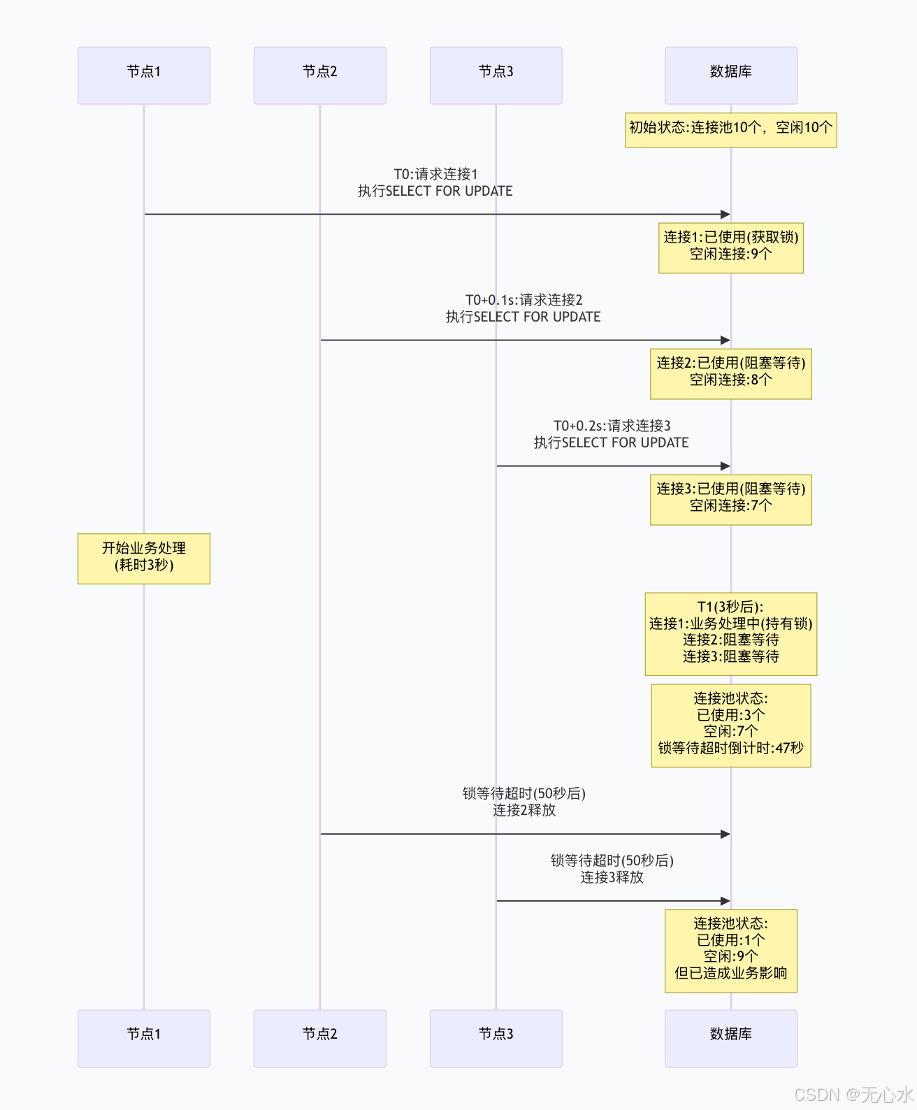 故障重现:3个节点同时执行SELECT FOR UPDATE,大量连接阻塞在锁等待上。